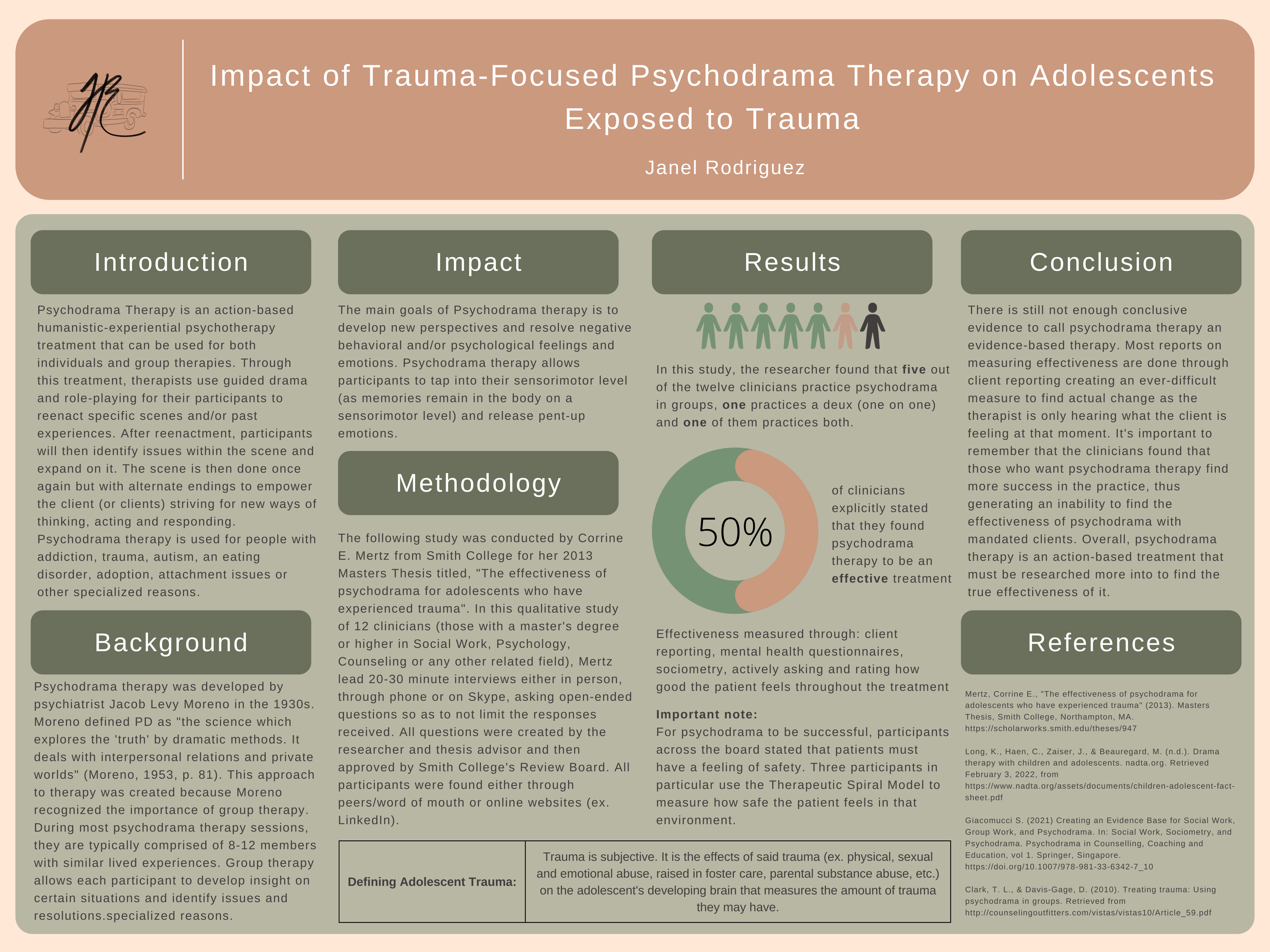 While attending a virtual shadowing event where I was able to learn from Nesrin Aldroubi (M.D.), Dr. Aldroubi mentioned how she recently learned about psychodrama therapy and its affects on children with trauma. As someone who is interested in the field of pediatrics and specifically childhood trauma, I went right to work, researching and falling into rabbit hole after rabbit hole. That same day, I was listening to Pediatrics On Call, a podcast that discusses current research in pediatrics at this moment. In one of the episodes, the hosts were talking about how the current mental health treatments in healthcare are unsustainable. With this medical poster, I wanted to present a mental health treatment that may be sustainable for the future of healthcare.